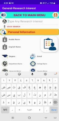 A Comprehensive Researcher and Research Interest Finder Platform provides two main types of search engines: A. Search about any researcher in any university around the world by typing any part of his/her name in Arabic or English language. B. Search about any research interest of any researcher in any university around the world by typing any keyword that is related to the research interest. The two main types of search engines are consist of two main classifications: General and Categorized.