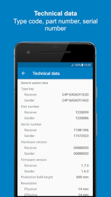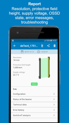 The SICK Safety Assistant reads configuration and diagnostic data from the SICK safety sensors deTec4, deTem A/P and scanGrid2 via NFC.