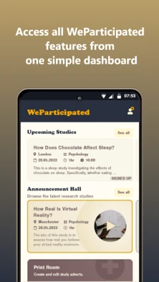 WeParticipated solves this problem by creating an app that allows all researchers to advertise their research studies on one platform in seconds, to a community of individuals highly engaged in research. This allows researchers to advertise their studies quickly and easily to people most likely to participate in their studies, and will give individuals interested in research quick and easy access to these opportunities.